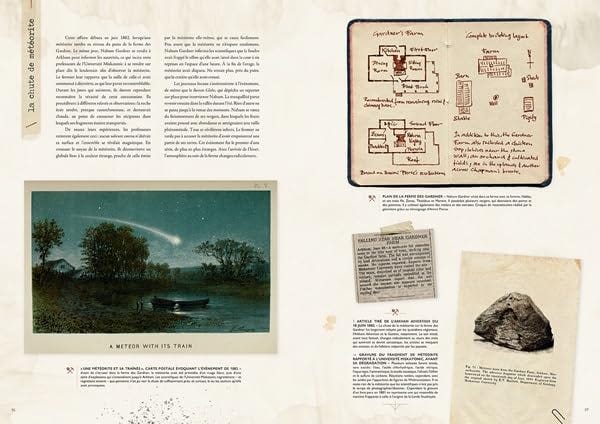 Cet Atlas Lovecraft se présente sous la forme d’un ouvrage grand format (37 x 27 cm environ) ce qui n’est pas le plus facile pour le manipuler mais permet d’apprécier pleinement les illustrations qu’il contient. Car c’est bien le but de ce volume de 180 pages : présenter une iconographie (issue des dossiers de la célèbre Miskatonic University bien sûr) mêlant notes manuscrites, croquis, documents administratifs, photgraphies, cartes et autres plans… des lieux mythiques réels ou inventés par H.P. Lovecraft.